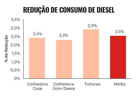 Na ordem de 2,3 %. Na mesma operação, os tratores apresentaram uma redução de 2,9% no consumo de diesel. Levando em conta todos os equipamentos, a redução média de consumo foi de 2,53%..