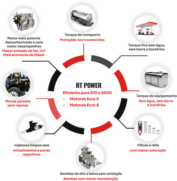 O RT Power aumenta muito os intervalos de trocas dos filtros e evita a manutenção frequente do sistema de injeção de diesel causada por contaminações. Possui propriedades químicas para combater os principais problemas relacionados à contaminação.